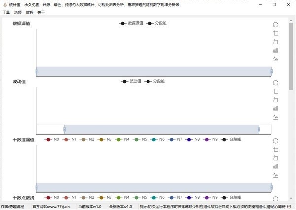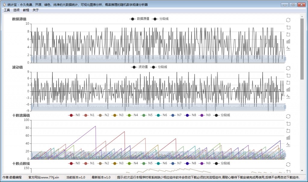奇趣统计宝内置数据源值图表、波动值图表、遗漏值图表、十数点数线图表、组合点数线图表、MACD线图表、K线图表、KDJ线图表等多个图表,方便您以各种量化指标对数据的规律、趋势、概率进行精准把握。