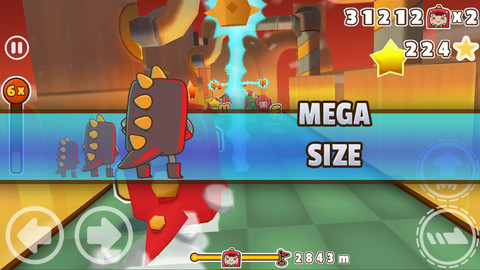 游戏为关卡制,作为一款新游,现在只有4个关卡,并且在每个关卡里都设有一个Boss。游戏的玩法很简单,右划动屏幕即可,上划跳跃,下划扑倒这些都与其他的相似!但有一点就是当前方出现敌人时,我们就需要下划屏幕,扑倒状态的恐龙仔可以撞飞敌人!在游戏过程中玩家除了捡取星星外,还要收集路程中出现的字母,当字母组成一个单词便可以引发技能,技能分为很多种,例如无敌前冲,飞行,喷火等等。在关卡的最后会出现一个Boss,需要按照游戏的提示来完成相应的操作!