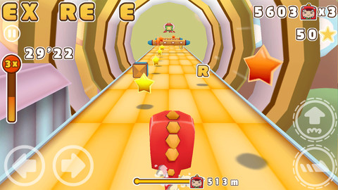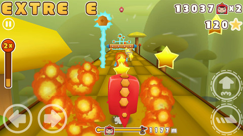 作为一款棒子国出品的跑酷游戏,画面肯定也符合棒子国的动画效果,主角设计的萌味十足!刚点击进入游戏后,便开始了一段十分通用,十分狗血的剧情,那就是主角与妹纸缠缠绵绵之时,恶人总会出现,然后不抓男偏偏就抓女的,于是主角就和打了鸡血一般穿上了小恐龙装扮,开始了拯救妹纸的道路。游戏背景的音乐十分的欢快,配合跑酷游戏再恰当不过了!在游戏过程中你只能看到我们的恐龙仔身穿恐龙服的背影,如同一块粉色的大年糕,扭着尾巴向前跑,十分的搞笑!