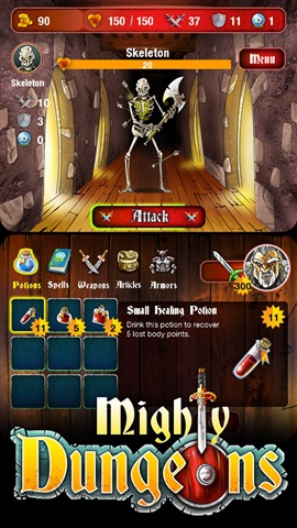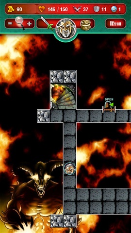 《伟大的地下城》这款游戏采用ios平台惯用的触屏操作,容易上手,操作非常简单,任何功能都可以靠一根手指进行操作,不过屏幕的界面功能由于是英文的关系,所以需要完全理解其意义的话要花不少时间,在地图中,屏幕上方显示玩家数据,包括了获得的金币,武器装备,血量等等,而在进入战斗画面的时候,上方显示战斗环境,包括了攻击力,防御值以及怪物血量,还有指令操作等等,下方则是各种技能以及道具图标,整体来说排版分布整齐,玩家不会找不到相应的功能位置,缺点的话,那就是前面所说的语言障碍了,不过玩外文RPG很多的话,就完全不成问题。