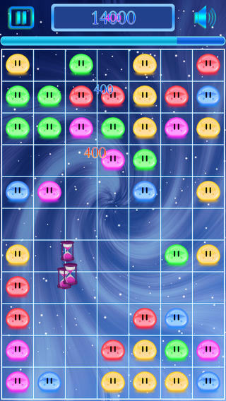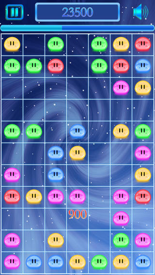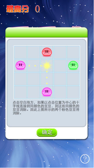 1.点击空白格子区域,如果有至少两个相同颜色的豆豆在十字线上,则豆豆消除,每次消除的越多,得分越多。