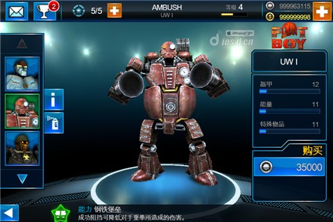 在这款续作中,共包含有 24 个风格迥异的机器人,宙斯、原子和双城等知名角色都会悉数登场。同样你可以使用比赛获得的奖励来对机器人进行升级或更换外观,当然也可以购买更高级的犀利角色。为了轻松取得胜利,在比赛开始前还可以花上少量的内购币来获取一些特殊道具,比如快速充能、双倍伤害、生命回复等等,不过花钱最多的地方还是在"比赛次数"的购买上,价格上笔者认为还是略显坑爹。